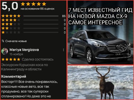 Ваш гид, тот самый Сергей. Предлагаю Вам самые популярные , индивидуальные экскурсии на новой, комфортной MAZDA CX9, вместительностью от 1 до 6 человек. Работаю без посредников. По Вашему желанию, спланирую маршрут специально для Вас, в зависимости от Ваших интересов и предпочтений. В комфортной поездке, где будут только Вы и Ваши близкие, я расскажу и покажу захватывающую и увлекательную историю Калининграда и области, подскажу самые необычные и вкусные места! Средняя длительность поездки рассчитана на 8 часов, ее также можно редактировать, исходя из Ваших пожеланий. Для комфорта гостей, в моей машине всегда есть зонт, бинокль, теплый плед и прекрасное настроение).